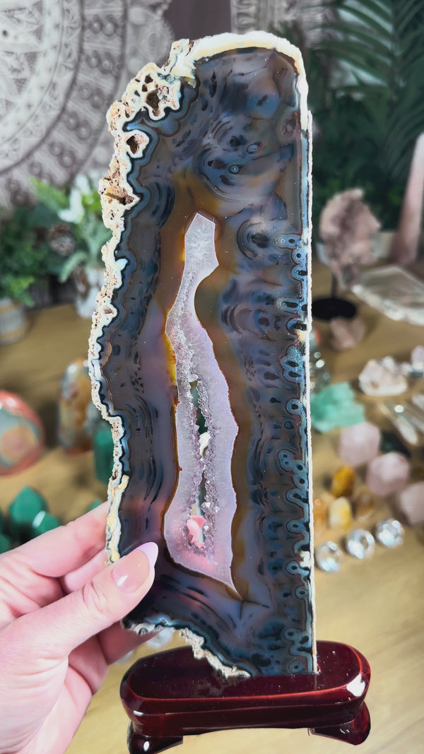 A stunning, large pair of top quality Agate slabs with custom-fit wooden display stands from Soledade, Rio Grande do Sul, Brazil! You will receive the exact pair of agates depicted in the listing photos and videos upon purchase.